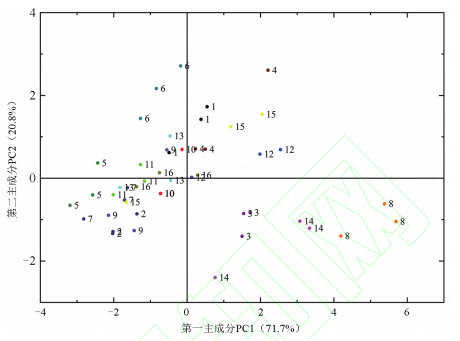 圖2是基于山櫻花香氣的電子鼻數(shù)據(jù)(W1C、W5S、W1S、W1W、W2W和W3S傳感器響應(yīng)值G/G0)構(gòu)建的主成分分析圖(PCA)。第一主成分PC1的貢獻(xiàn)率為71.7%,第二主成分PC2的貢獻(xiàn)率為20.8%,總貢獻(xiàn)率達(dá)到92.5%,說明第一、第二主成分能很好地反映供試樣品的整體信息。從圖2可以看出,3、6、8和14號(hào)處理組合與其他處理組合的樣本點(diǎn)沒有重疊,由此可以區(qū)分出3、6、8和14號(hào)處理。結(jié)合圖1可知8號(hào)處理各傳感器的響應(yīng)值顯著高于其他處理,且與其他處理差異極顯著。因此,8號(hào)處理,即A2B4C3D2處理組合(在12:00采集盛開時(shí)期的櫻花花朵4g,在頂空平衡30min后進(jìn)行電子鼻測定)的表現(xiàn)最優(yōu),為電子鼻快速測定櫻花香氣的最優(yōu)組合。