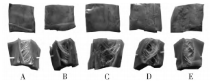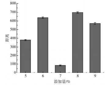 02 質(zhì)構(gòu)特性分析由表1可知,辣椒的添加明顯影響了植物蛋白肉的硬度,樣品的硬度呈先減小后增大的趨勢(shì),辣椒添加量為9%時(shí)硬度最大,7%時(shí)硬度最小。植物蛋白肉的咀嚼性隨著辣椒添加量的增加呈先增大后減小的趨勢(shì),辣椒添加量為7%的樣品的咀嚼性最大,辣椒添加量為9%的樣品的咀嚼性最小。當(dāng)辣椒添加量小于7%時(shí),樣品的組織化度隨著辣椒添加量的增加而增大,添加量大于7%時(shí),組織化度隨著辣椒添加量的增加而減小。