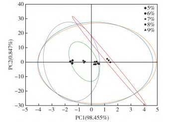 圖2顯示了每個(gè)植物蛋白肉樣品的味道接近程度,在主成分分析圖上,樣品之間距離越大,表明樣品之間的整體滋味差異越大;樣品之間距離越小,表明樣品之間的滋味越相似。第一主成分(PC1)與第二主成分(PC2)的貢獻(xiàn)率分別為98.455%和0.847%,兩者貢獻(xiàn)率之和達(dá)到了99.302%,樣品在電子舌主成分分析圖上的區(qū)分指數(shù)達(dá)到96,表明PC1和PC2包含了原始數(shù)據(jù)的大多數(shù)信息,能夠反映樣品的整體信息。不同樣品間較明顯地分為了4個(gè)區(qū)域,9%和8%之間的距離相對(duì)較小。PCA結(jié)果說(shuō)明基于電子舌滋味檢驗(yàn)?zāi)苡行^(qū)分5個(gè)樣品。