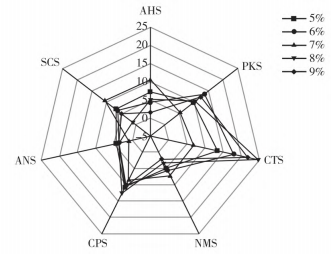 不同樣品酸味、甜味、苦味、咸味、鮮味5個(gè)滋味的排序見(jiàn)圖3,電子舌傳感器相對(duì)強(qiáng)度值存在明顯差異,表明電子舌測(cè)試可有效地區(qū)分不同樣品的滋味。5個(gè)樣品在ANS傳感器上的響應(yīng)強(qiáng)度無(wú)明顯差異,在SCS、PKS、NMS、CTS、CPS、AHS傳感器上的響應(yīng)強(qiáng)度存在差異,不同樣品的酸味、咸味、鮮味相對(duì)強(qiáng)度值從小到大的順序?yàn)樗嵛杜判颍?%<8%<9%<7%<5%,咸味排序:6%<9%<8%<7%<5%,鮮味排序:6%<8%<9%<7%<5%。