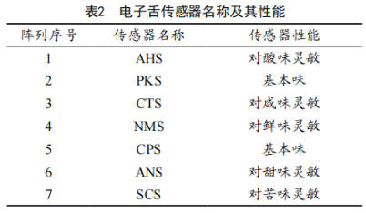 米飯與水按照1:15的比例混勻,浸泡10 min,取80 mL待測液放于電子舌專用杯中檢測。電子舌傳感器名稱及其性能描述見表2。
