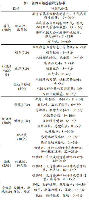 邀請10位具有感官品評經(jīng)驗的人員,對苦蕎米飯進行感官評價,評分細則見表3。
