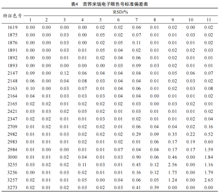 通過電子眼檢測,占比在1%以上的特征色號有22個。其中,隨著苦蕎米添加量的增加,占比在增大的特征色號有13個,如:1619、1875、1876、1891、1892、1893、2147、2148、2163、2164、2165、2421、2437;隨著苦蕎米添加量的增加占比在減少的特征色號有9個,如:2709、2982、2983、2984、3000、3255、3256、3257、3273。為驗證電子眼采集圖像的穩(wěn)定性,以確保實驗數(shù)據(jù)的可靠性,計算樣本的相對標準偏差(Relative standard deviation, RSD),結果如表4所示。樣本特征色號RSD值均小于5%,表明電子眼采集的苦蕎米飯色澤數(shù)據(jù)具有良好的重現(xiàn)性,可滿足后續(xù)分析。