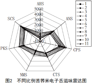 對所有樣品電子舌傳感器的響應值繪制雷達圖(圖1),其中SCS苦味傳感器、CPS基本味傳感器的響應值最高,其次是ANS甜味傳感器、CTS咸味傳感器、PKS基本味傳感器的響應值較高。