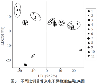 經(jīng)電子鼻測定的線性判別分析如圖2所示。由圖可知,LD1的貢獻率為52.2%,LD2的貢獻率為31.9%,其累計貢獻率為84.1%,能夠反映樣品中的大部分氣味信息。1、2、11號樣本與其余樣本距離較遠,表明了1、2、11號樣本與其余樣本之間的差異較大。6~10號樣本距離較近,存在部分重疊現(xiàn)象,說明這幾組樣本氣味相似,并且隨著苦蕎米添加量的增大,樣本呈現(xiàn)出從左向右依次移動的趨勢。1、2號樣本米飯的香味較重、苦蕎的香味較淡,苦蕎香味從3號樣本開始逐漸明顯,11號樣本苦蕎味過重。