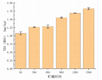 過氧化值是反映油脂氧化的重要指標(biāo),不同貯藏期的POV值如圖1所示。在-18℃條件下,預(yù)制紅燒肉的過氧化值隨貯藏時間增加而增長,其中只有60d和150d有明顯增加。不同貯藏時期的TBA反應(yīng)物值如圖2所示,TBA值隨貯藏時間顯著上升(P<0.05),貯藏0d的MDA含量約為1.07mg/kg,貯藏150d后,MDA含量增加到1.75mg/kg,這是因為過氧化物的不穩(wěn)定性質(zhì)會進(jìn)一步的分解為二次氧化產(chǎn)物如丙二醛。但預(yù)制紅燒肉在-18℃條件凍藏150d的過氧化值和丙二醛含量均低于GB10146—2015的限制量,仍保持在安全的范圍內(nèi)。