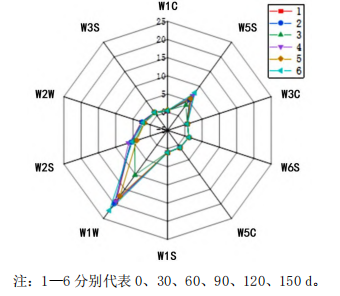 圖3 不同貯藏期電子鼻傳感器響應(yīng)值雷達(dá)圖