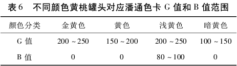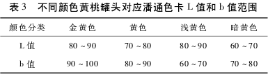 為了減少其他因素的干擾如品牌、價格、廣告、經(jīng)驗等方面的影響,本實驗決定采用雙盲法進(jìn)行檢驗。所有的樣品都用3個隨機(jī)的數(shù)字進(jìn)行編碼,檢驗樣品也隨機(jī)化。在進(jìn)行試驗之前罐頭要先打開5min,再將桃片放在白色瓷盤上。由訓(xùn)練型評價員以潘通色卡為參比物,尋找和黃桃罐頭相對應(yīng)的色卡,記錄下其Lab值和RGB值,然后再由訓(xùn)練型評價員根據(jù)經(jīng)驗,按照金黃色、黃色、淺黃色、暗黃色將其分為四類。