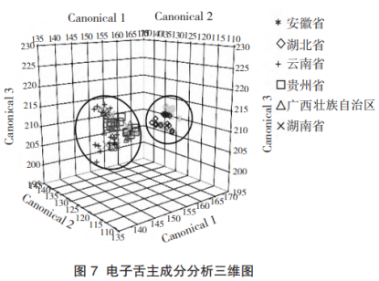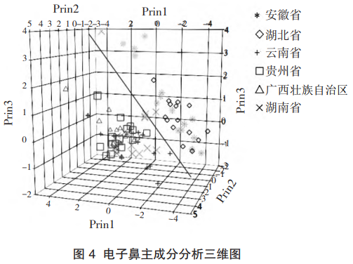 電子鼻主成分分析的結(jié)果表明,前三個(gè)主成分的特征值均大于1,其累積貢獻(xiàn)率達(dá)95.05%,由圖4可知,安徽和湖北的茯苓樣品存在較大的重疊,云南、貴州、廣西和湖南的樣品重疊更為嚴(yán)重。
