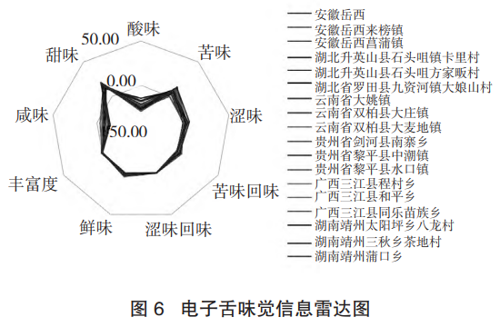 不同于以往人們對(duì)茯苓滋味的認(rèn)識(shí),茯苓樣品除咸味、酸味外,其他的味覺(jué)屬性基本都在無(wú)味點(diǎn)以上,說(shuō)明茯苓具有豐富的味覺(jué)信息。茯苓最突出的味道是甜味和苦味。另外,不同產(chǎn)地茯苓的某些味覺(jué)屬性在雷達(dá)圖上重疊度較低,如酸味、澀味和苦味的回味,但各個(gè)產(chǎn)地的樣品酸味響應(yīng)值在無(wú)味點(diǎn)-13以下,見(jiàn)圖6。