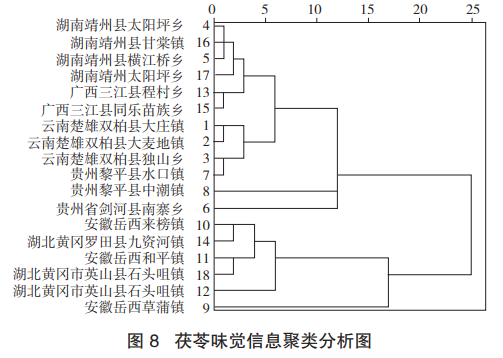 圖7為電子舌檢測(cè)結(jié)果的響應(yīng)值降維后所得的主成分分析結(jié)果??傮w來(lái)看,西南地區(qū)(云南、廣西、貴州)的茯苓樣品與岳西地區(qū)(安徽、湖北)的茯苓樣品能夠得到大致劃分。