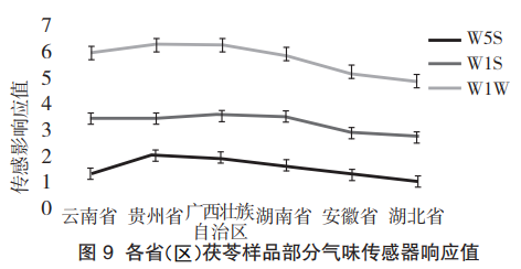 從茯苓氣味的PCA分析結(jié)果可知,在地理位置上以長(zhǎng)江為分界點(diǎn),能有效區(qū)分長(zhǎng)江以北和長(zhǎng)江以南的茯苓樣品。云南、貴州、廣西、湖南的樣品生長(zhǎng)和采收于長(zhǎng)江以南,湖北和安徽的樣品生長(zhǎng)和采收于長(zhǎng)江以北。根據(jù)雷達(dá)圖可知,W5S、W1S和W1W傳感器響應(yīng)值較高,Loadings分析結(jié)果顯示茯苓氣味的差異主要來(lái)源于無(wú)機(jī)硫化物、有機(jī)硫化物、甲基類化合物和氮氧化合物。因此選擇對(duì)上述氣味靈敏的傳感器進(jìn)一步分析茯苓氣味的產(chǎn)地差異,結(jié)果如圖9所示,安徽和湖北的茯苓樣品氣味響應(yīng)值顯然低于云南、貴州、廣西、湖南的樣品,說(shuō)明長(zhǎng)江以北和長(zhǎng)江以南的樣品在無(wú)機(jī)硫化物、有機(jī)硫化物、甲基類化合物和氮氧化合物氣味成分上存在較大差異。