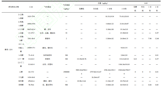 空白組中十二醛(脂肪味)、十四烷醛(花、蠟味)、辛醛(脂肪、肥皂味)、壬醛(脂肪味)OAV>1,對空白組的風(fēng)味起到主要作用。桉葉醇(薄荷、甜味)和1-十一烷醇(柑橘味,0.1<OAV<1)是發(fā)酵組中特有的風(fēng)味物質(zhì),在發(fā)酵手撕牛肉干形成特殊風(fēng)味中起到重要的作用。9-十六烯酸乙酯,為發(fā)酵手撕牛肉干提供了更多香味。