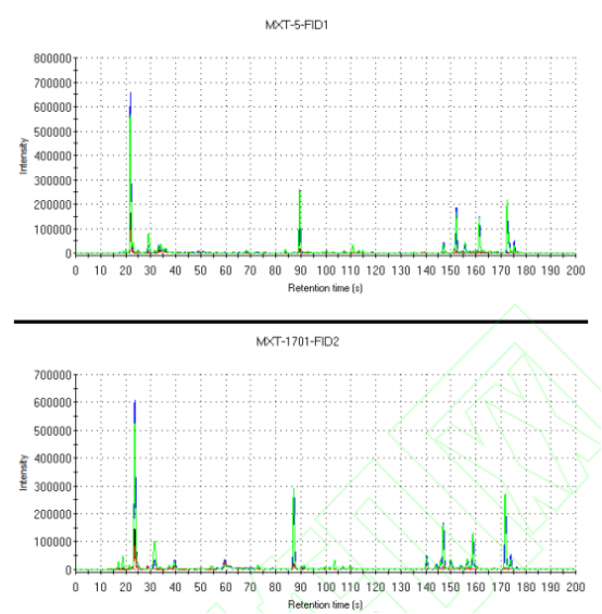 將GC數(shù)據(jù)進(jìn)行同組疊加處理可以更清晰地觀察組內(nèi)共有特征和細(xì)微差異,有助于識(shí)別同組樣本中普遍存在的化合物及其相對(duì)含量。圖2~圖9為各組(組1~組4)沒(méi)藥樣品原始GC疊加圖和雷達(dá)圖疊加圖,GC疊加圖分別展示MXT-5非極性毛細(xì)管柱與MXT-1701中極性毛細(xì)管柱結(jié)果,雷達(dá)圖也可以看出組間和組內(nèi)沒(méi)藥峰面積和保留時(shí)間的差異。組1(JZ1∼JZ4、JZ6)、組2、組3、組4(K1、M5、J1、W1、JZ5)在各自的GC疊加圖和雷達(dá)圖疊加圖中均呈現(xiàn)出相似特征:出峰時(shí)間差異不大、峰面積差異較大。