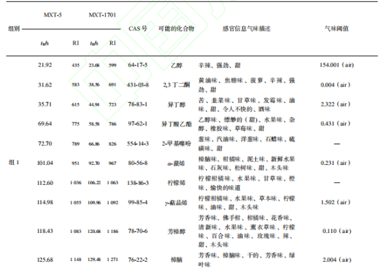 表2 各組沒(méi)藥可能含有的化合物信息及其氣味描述